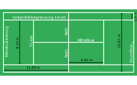 Die Maße des Spielfeldes sind 23,77 m lang und für das Einzelspiel 8,23 m breit, für das Doppelspiel 10,97 m breit. Getrennt wird das Spielfeld in der Mitte durch ein Netz, dass Links und Rechts an Netzpfosten eingehängt ist.